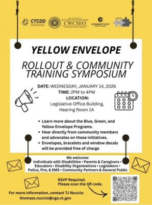 The statewide rollout of Connecticut’s Yellow Envelope Program & Community Training Symposium will be held on January 14, 2026, at the Legislative Office Building, Hearing Room 1A. This event will be from 2:00 PM to 4:00 PM, and is open to the public, but individuals with disabilities, disability rights or related advocacy organizations, first responders, and legislators are encouraged to attend. Limited seating is available, and registration is required, so please be sure to REGISTER! If you have any questions, please contact: TJ Nuccio at: thomas.nuccio@cga.ct.gov